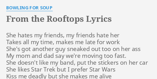 She hates my friends my friends hate her takes all my time makes me late for work she s got anothe. Bowling for soup from the rooftops. Love album including song video artist biography translations and more. From the rooftops lyrics.